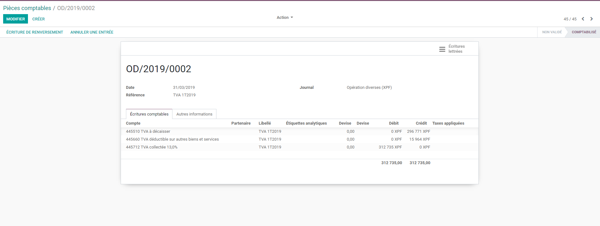 Je reviens vers toi pour la déclaration TVA, je n'ai pas bien compris les écritures a passer. Je t'ai mis en pièce-jointe la déclaration TVA. J'ai fait un virement bancaire de 296 771 CFP. Pourrais-tu passer l'écriture st ? Et je regarderai comment faire pour les prochaines.